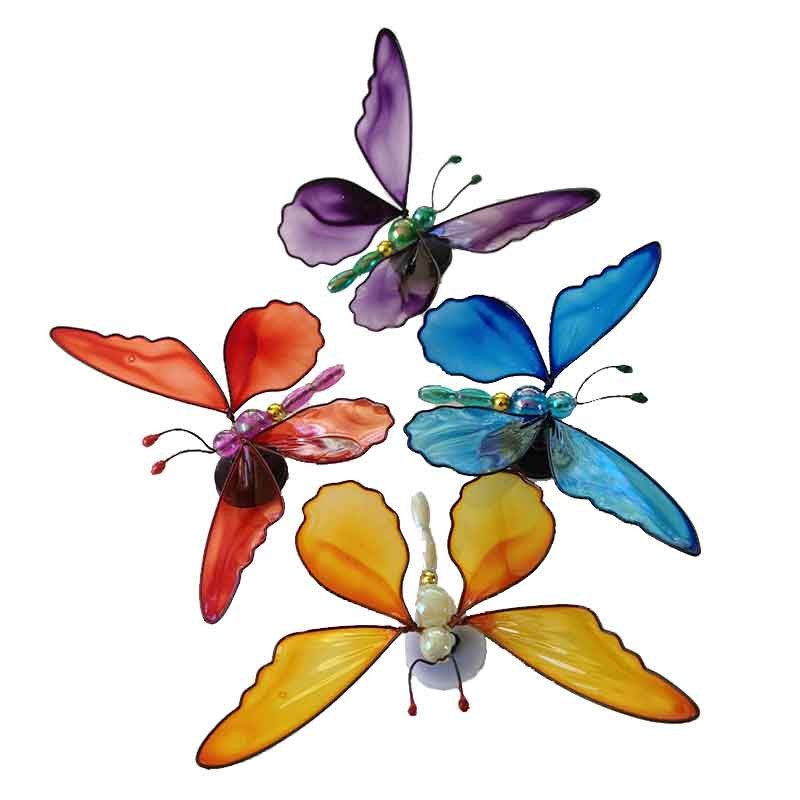 A colourful butterfly design fridge magnet. The body is made from wire and beads and the wings are made from wire coated with brightly coloured acrylic glaze. Colours dispatched with individual orders will vary. Packaged in a clear plastic 'pillow' container. Handmade in South Africa by a fair trade organisation.
