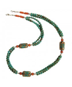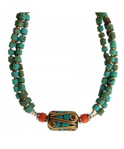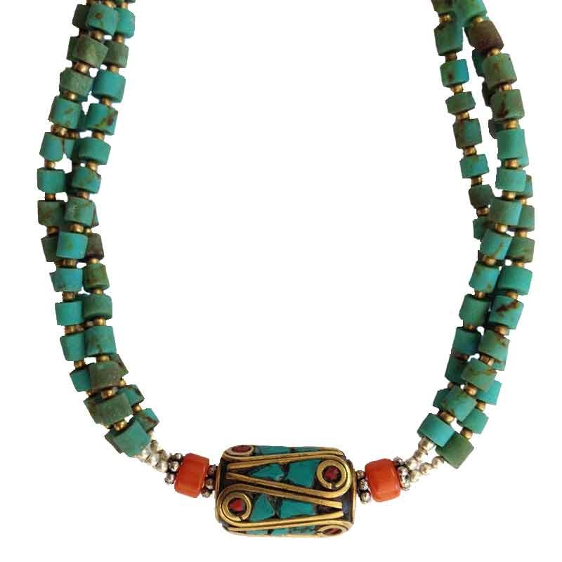 A unique and stylish bead necklace with a brass bead inlaid with turquoise and coral. Match with the turquoise earrings. A fair trade product handmade in Nepal. The supplier of this item donates 5% of their profits to women's and children's empowerment projects in Nepal.